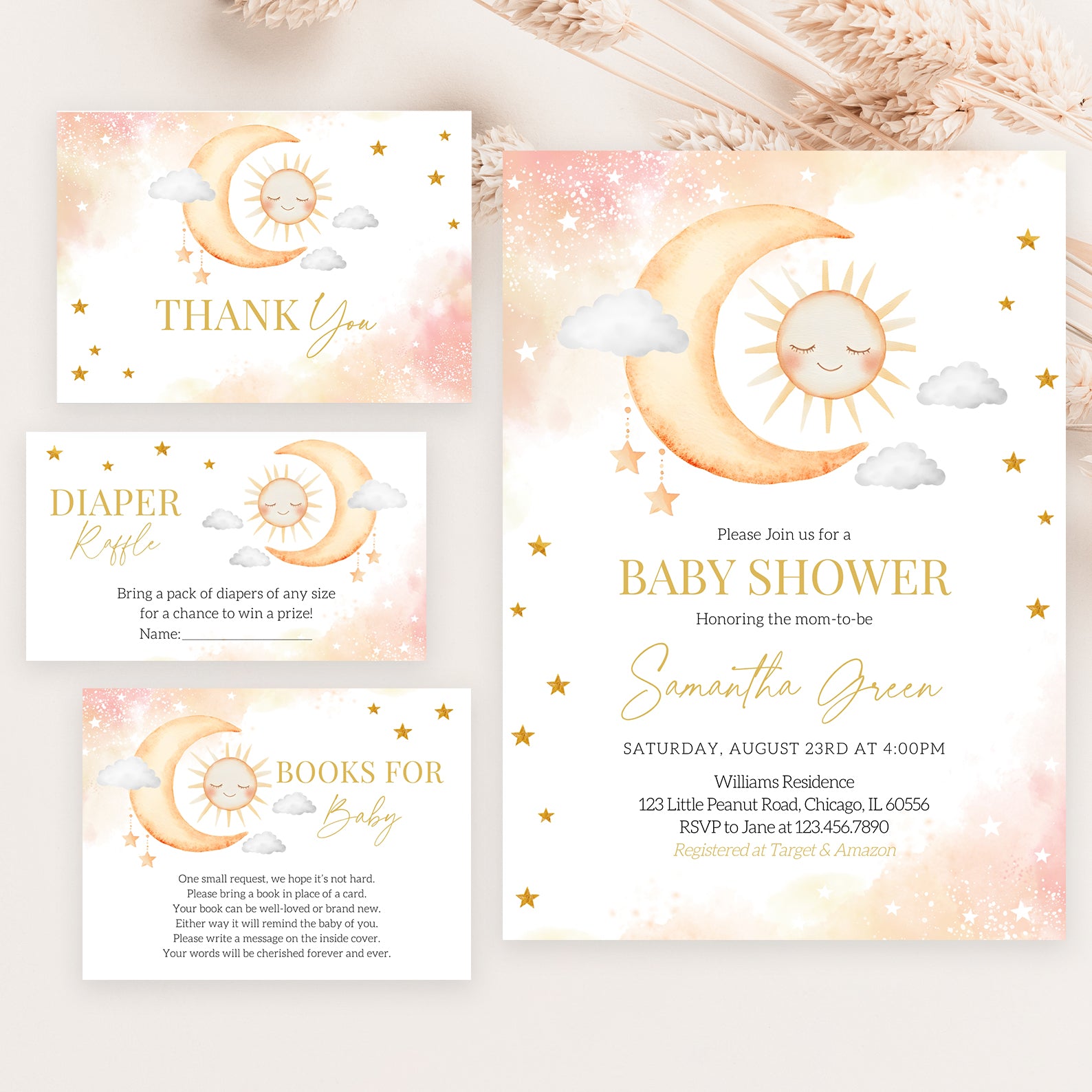 Summer Baby Shower Invite Bundle with Pastel Moon & Gold Stars