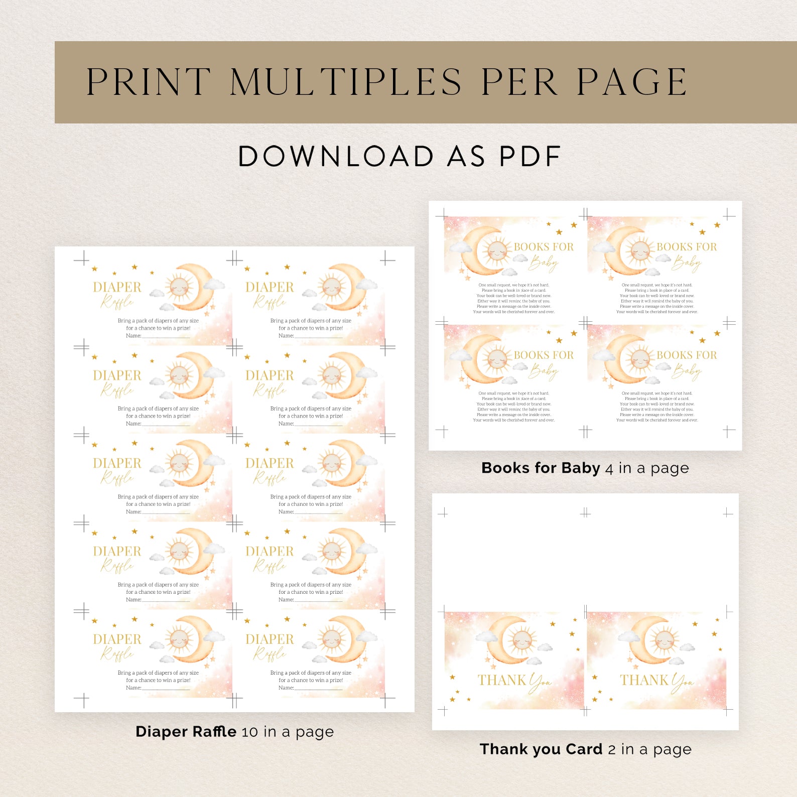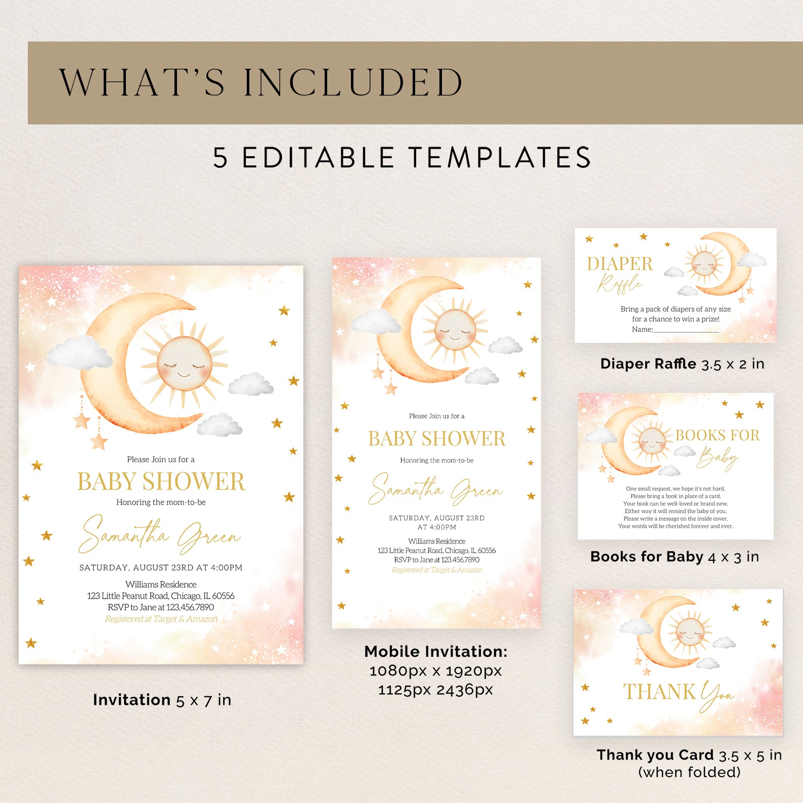 Celebrate your little one’s arrival with this dreamy summer baby shower invitation bundle! Designed with a soft pastel pink and orange background, it features a crescent moon, a falling star, and a sweet sleeping sun for a whimsical touch. Gold stars add a hint of sparkle, making this set perfect for a magical celebration. Includes an invitation, mobile invite, diaper raffle, books for baby, and thank you card.