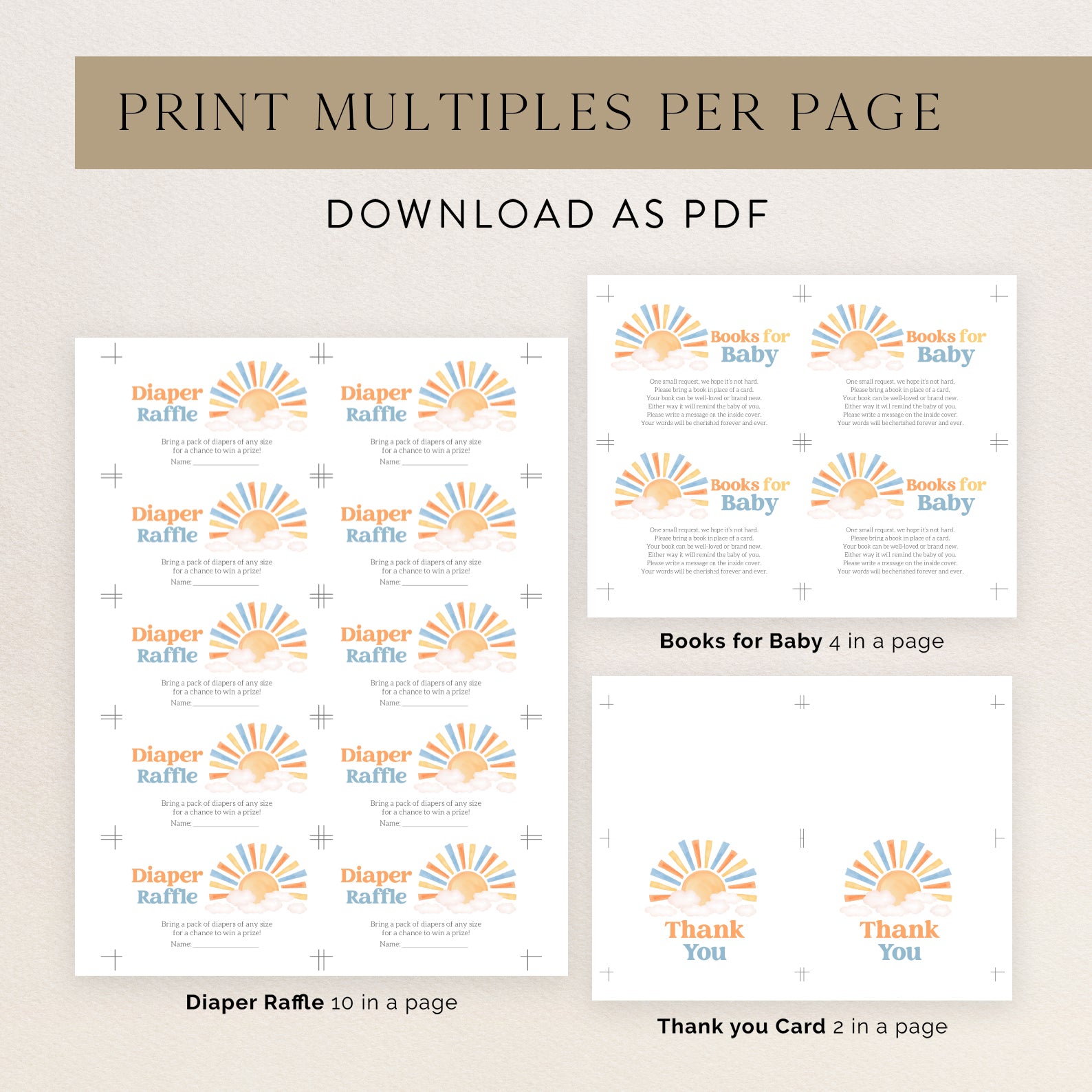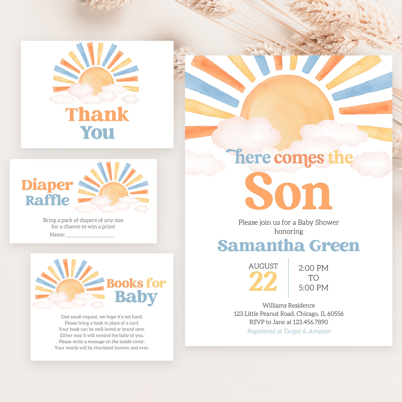 Celebrate your little one with this minimalist summer baby shower invitation bundle. Featuring a soft watercolor design with sun rays peeking through gentle clouds, this set includes an invitation, mobile invite, diaper raffle, books for baby, and a thank you card. Perfect for a warm and joyful celebration!