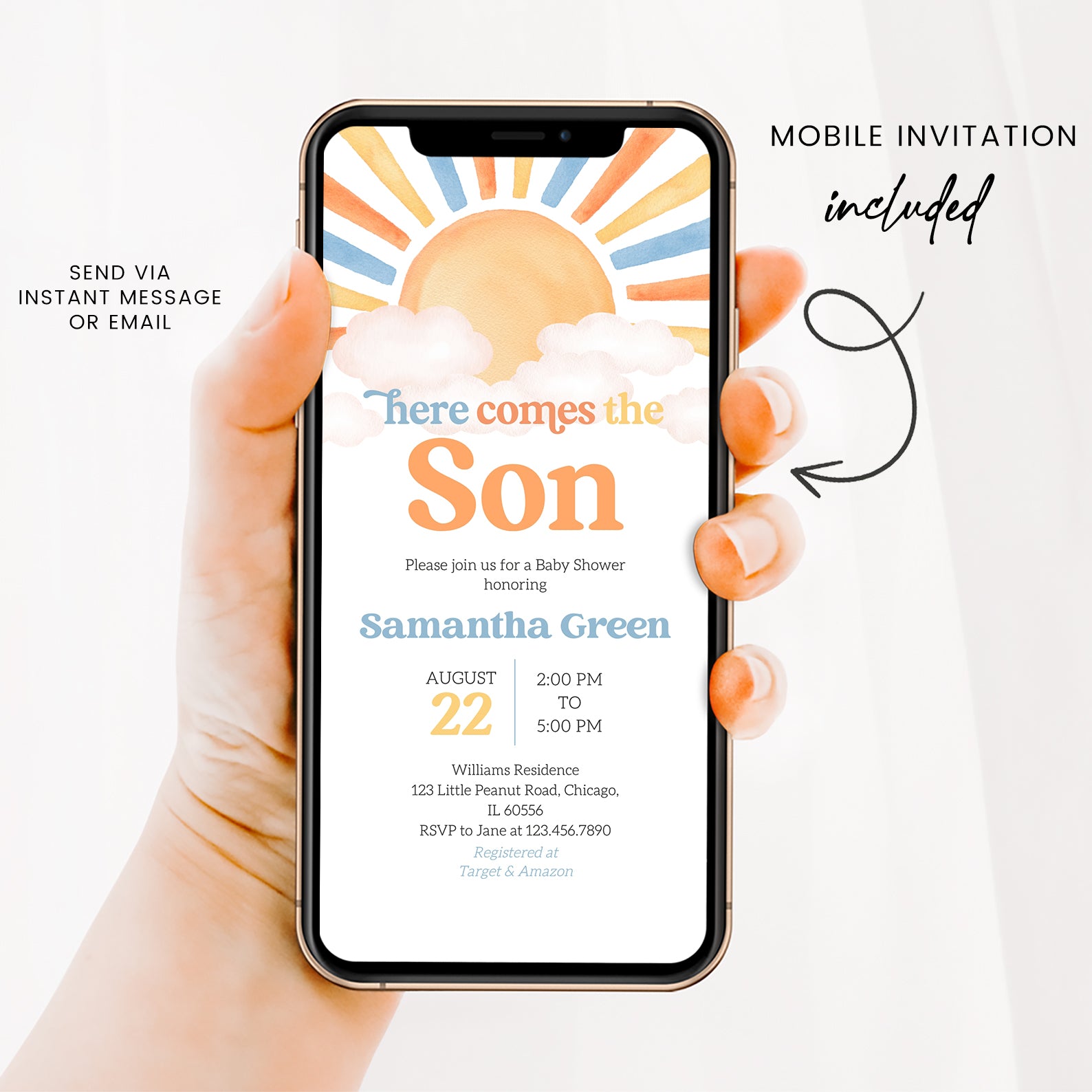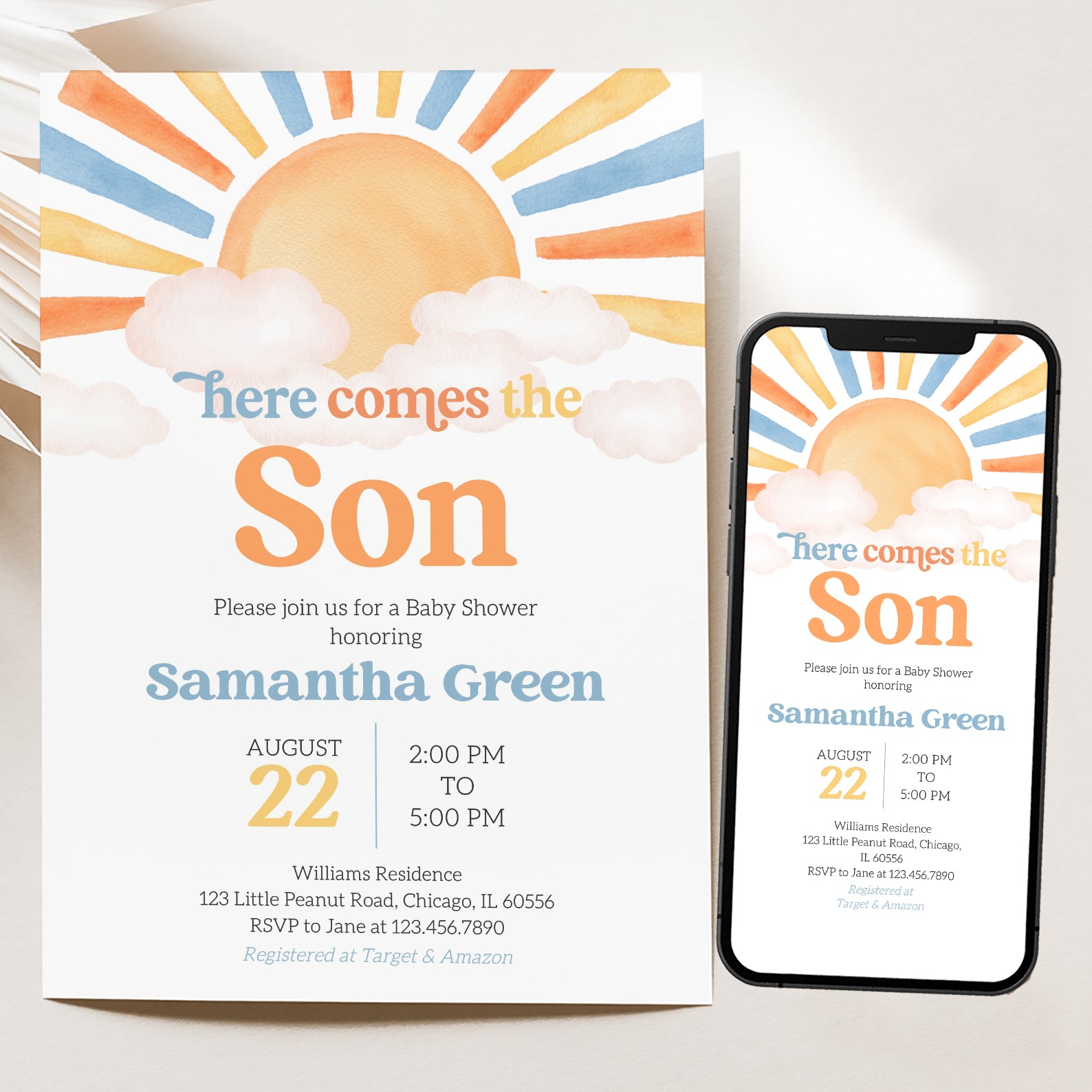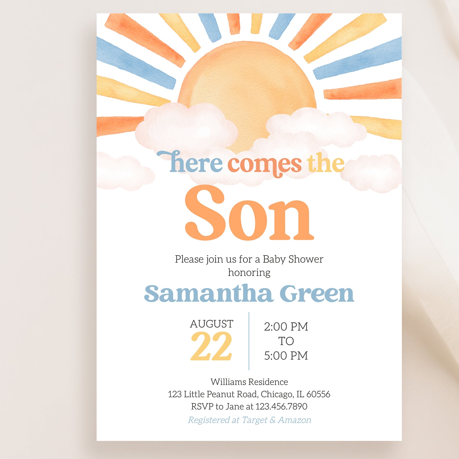 Celebrate the joy of new beginnings with our minimalist digital invitation for a summer baby shower, featuring a charming watercolor design. The invitation showcases radiant sun rays peeking through soft clouds, perfectly capturing the warmth and excitement of the season. Ideal for modern parents-to-be, this elegant invite sets the tone for a delightful gathering filled with love and sunshine.