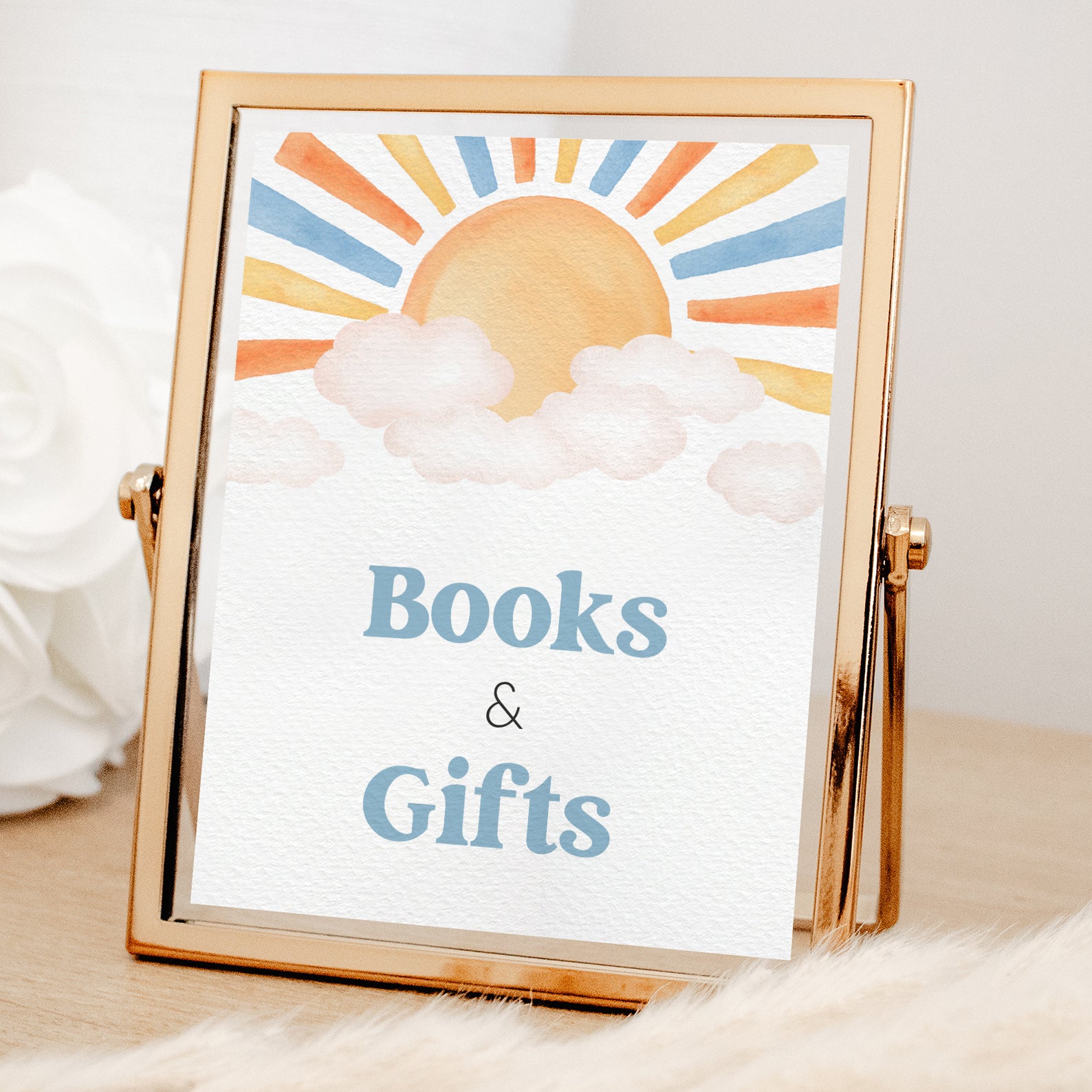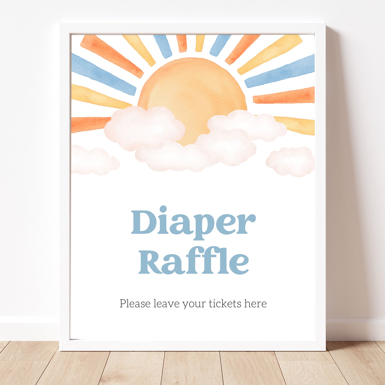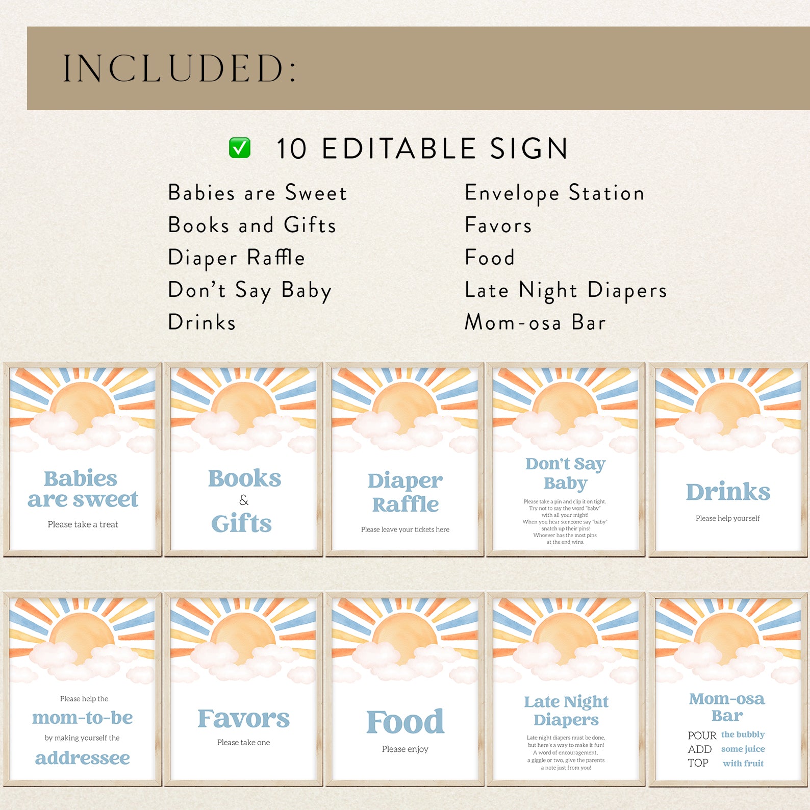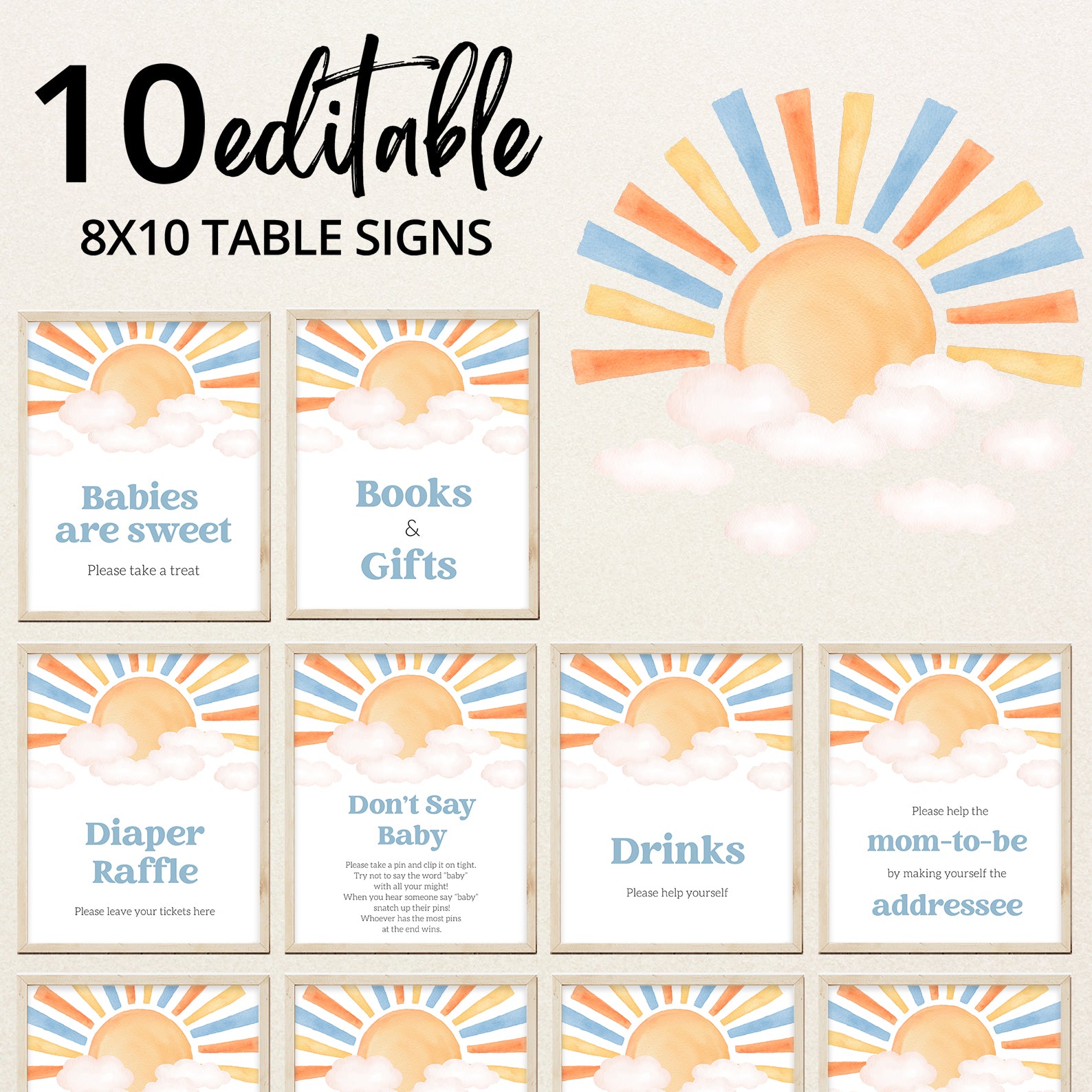 Bring warmth and charm to your baby shower with this minimalist set of ten editable table signs, featuring a soft watercolor design of radiant sun rays peeking through gentle clouds. Perfect for a summer celebration, these signs add a touch of elegance while guiding guests effortlessly. The set includes Babies Are Sweet, Books and Gifts, Diaper Raffle Sign, Don't Say Baby, Drinks Sign, Envelope Station, Favors, Food Sign, Late Night Diapers, and Mom-osa Bar, creating a beautifully coordinated event atmosphere.
