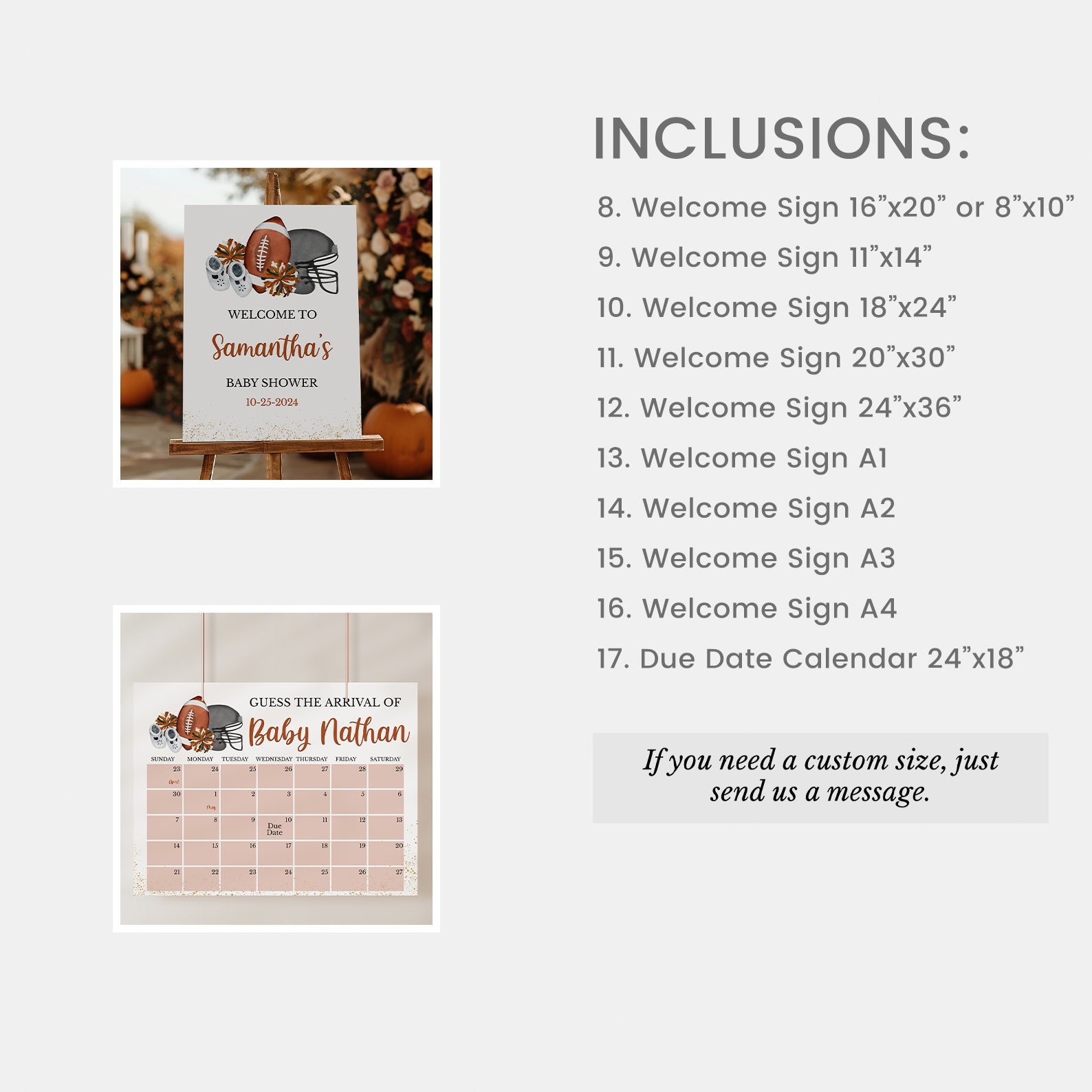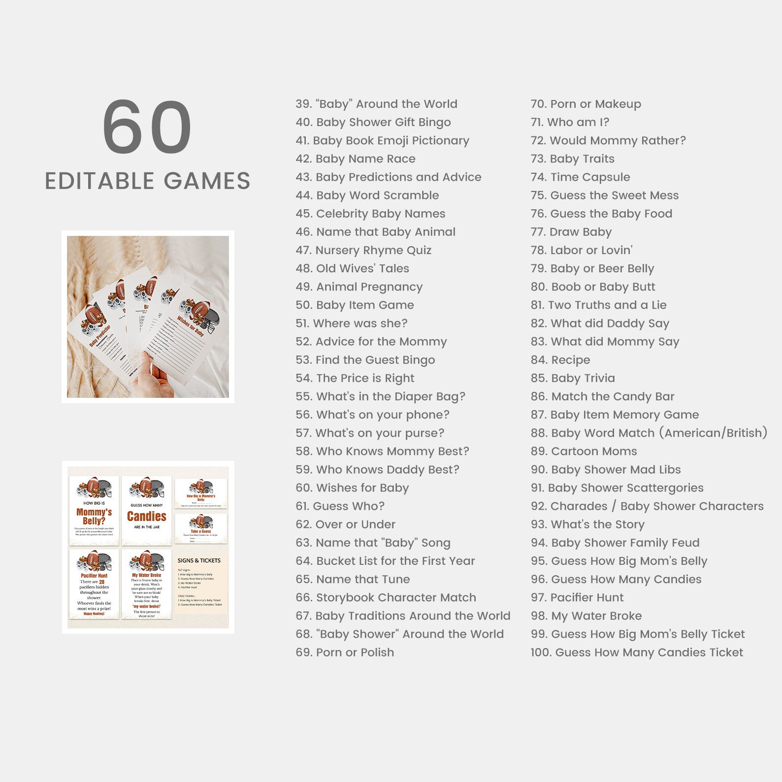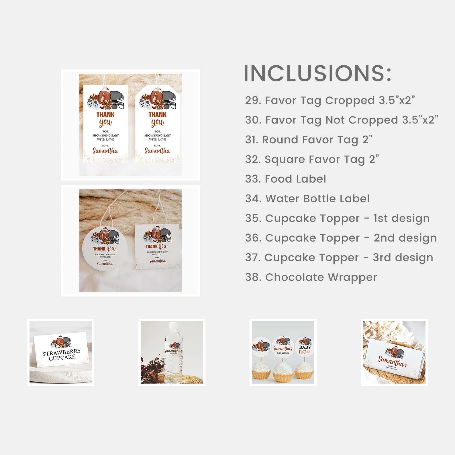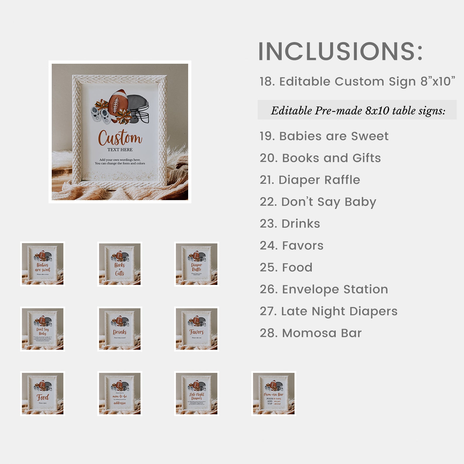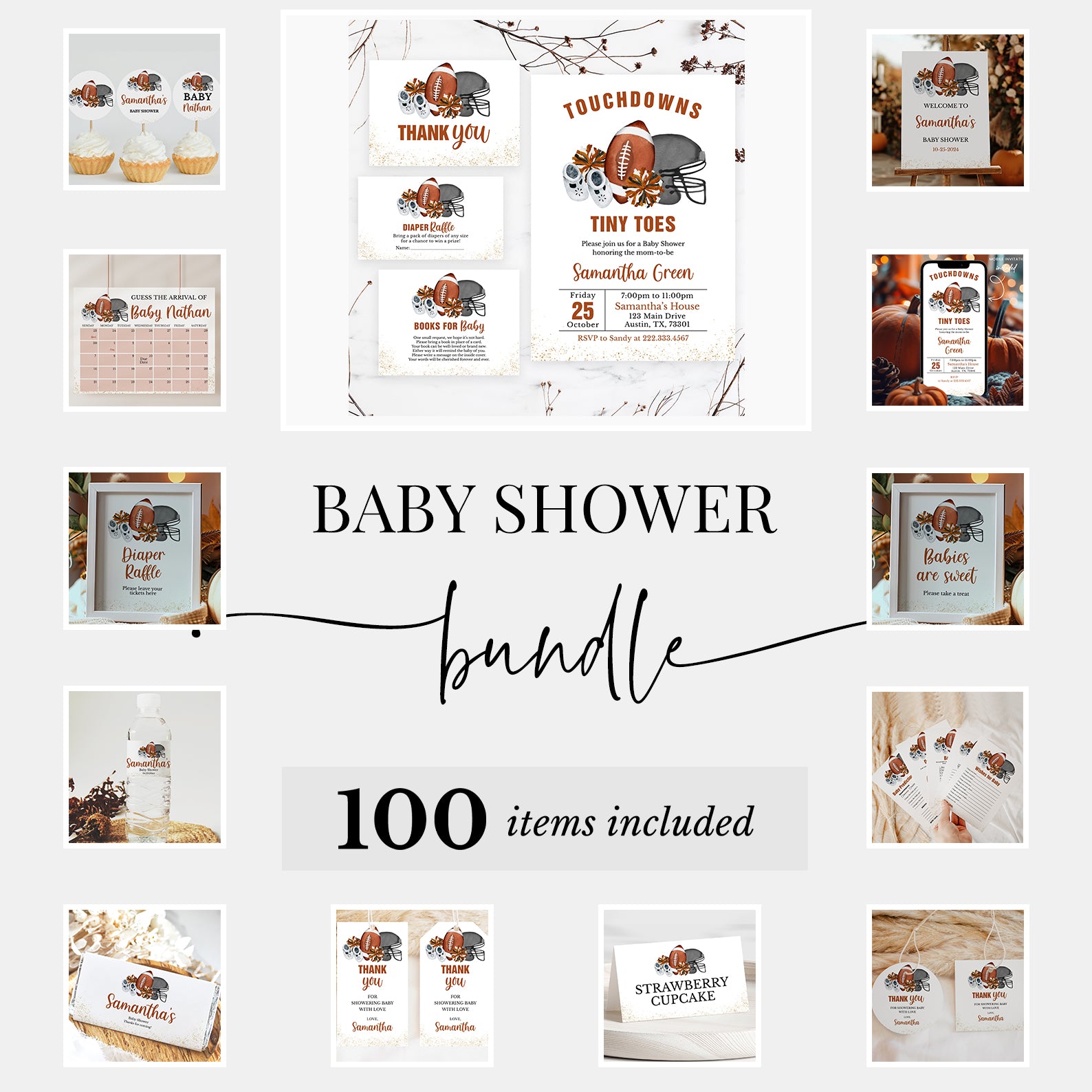 Create a winning celebration with our all-in-one baby shower mega bundle! This 100-piece football-themed set includes everything invites, diaper raffle cards, thank you notes, favor tags, cupcake toppers, and 60+ games. Designed with touchdown details like footballs, jerseys, and autumn tones, this bundle brings sporty spirit and seamless style to your baby shower. All items are editable and easy to print for a stress-free party setup.