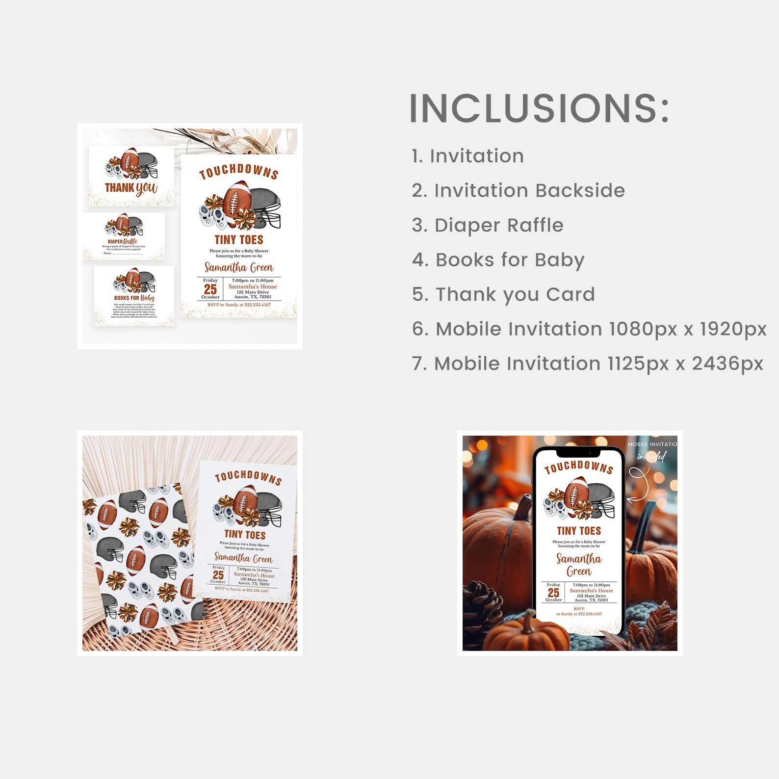 - Purchase this Touchdown Tiny Toes Fall Baby Shower Mega Bundle with Football template