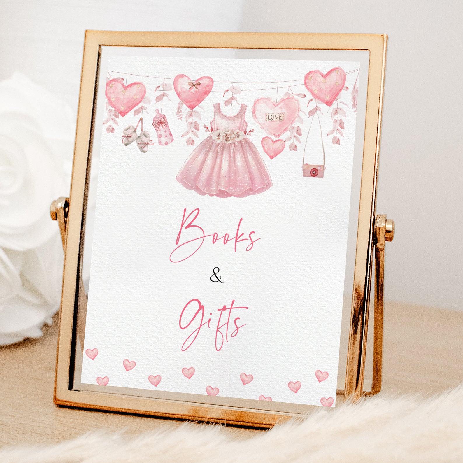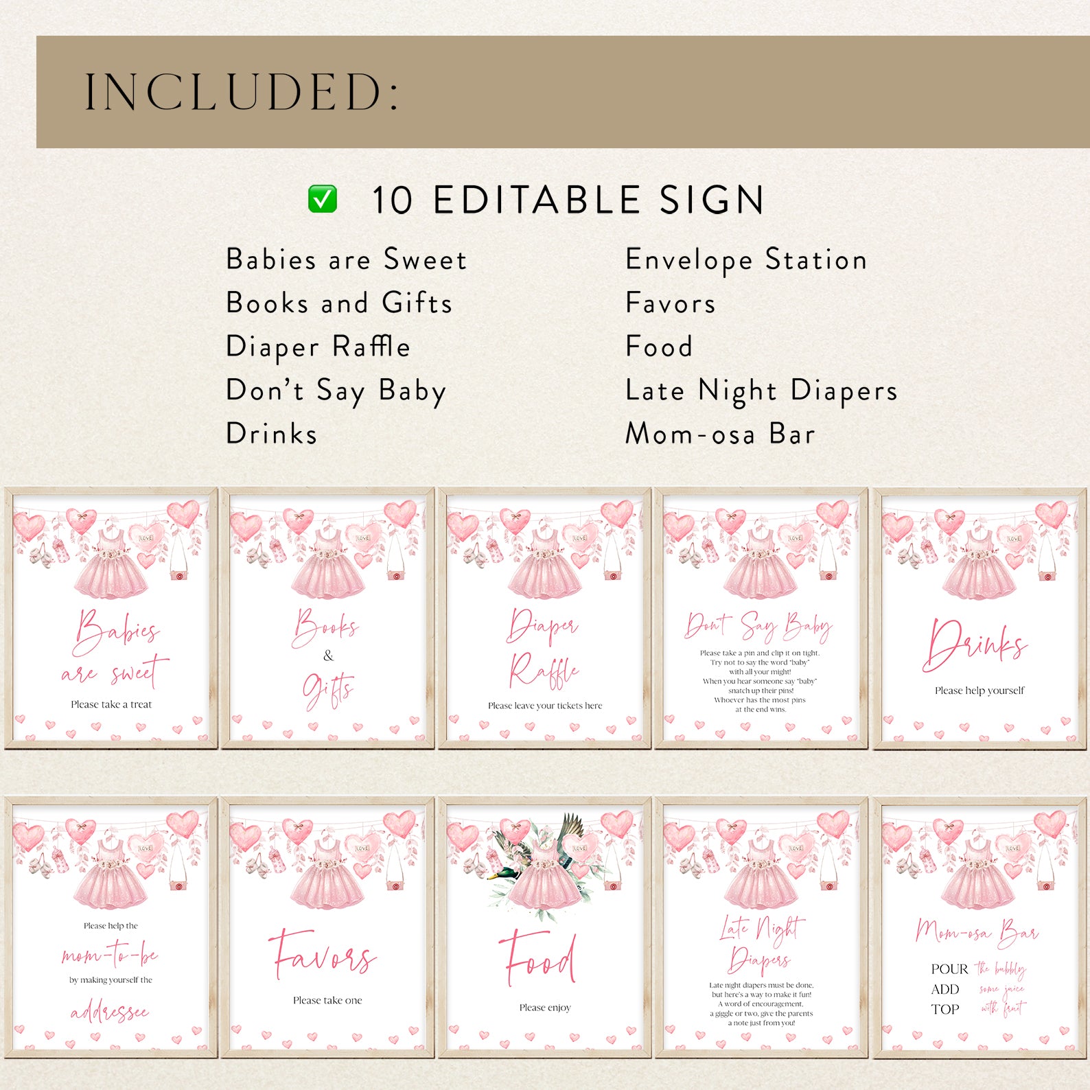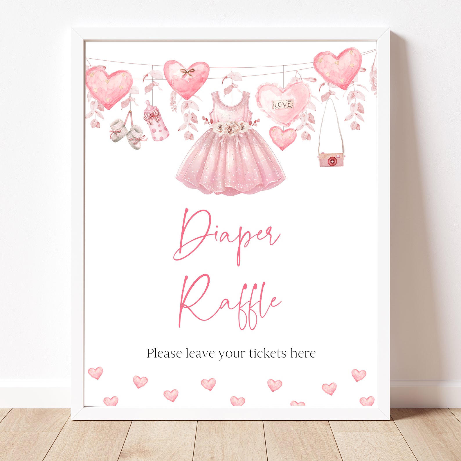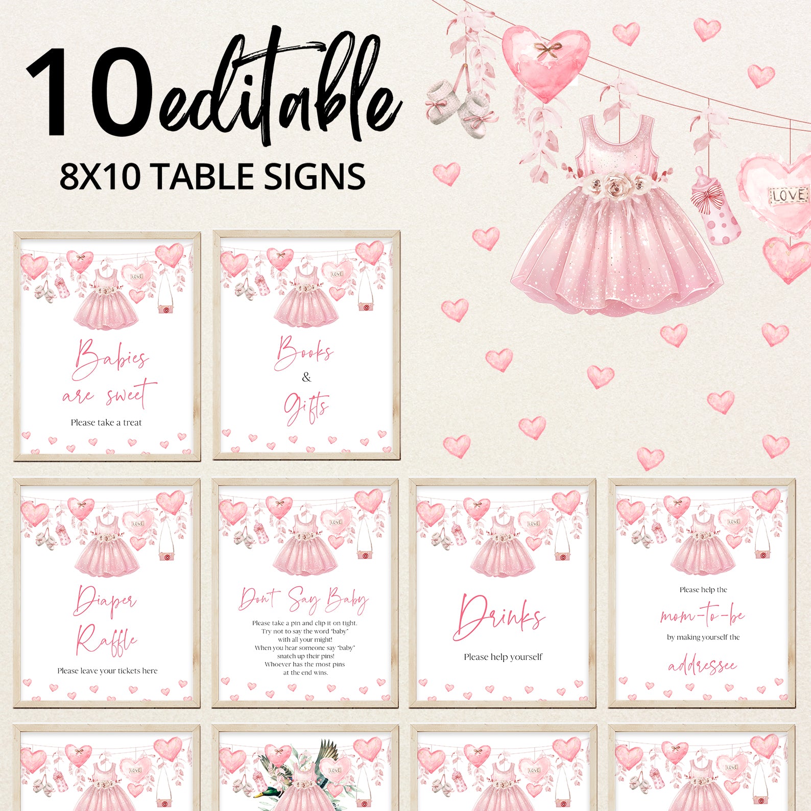 Add a sweet touch to your baby shower with these charming Valentine’s-themed table signs! Featuring adorable hearts, baby shoes, a cute baby bottle, and a lovely pink baby dress, each sign is designed to complement your special celebration. The whimsical pink camera and elegant hanging pink leaves add a playful yet sophisticated touch. Includes Babies Are Sweet, Books & Gifts, Diaper Raffle, Don't Say Baby, Drinks, Envelope Station, Favors, Food, Late Night Diapers, and Mom-osa Bar—perfect for organizing a heartwarming event!