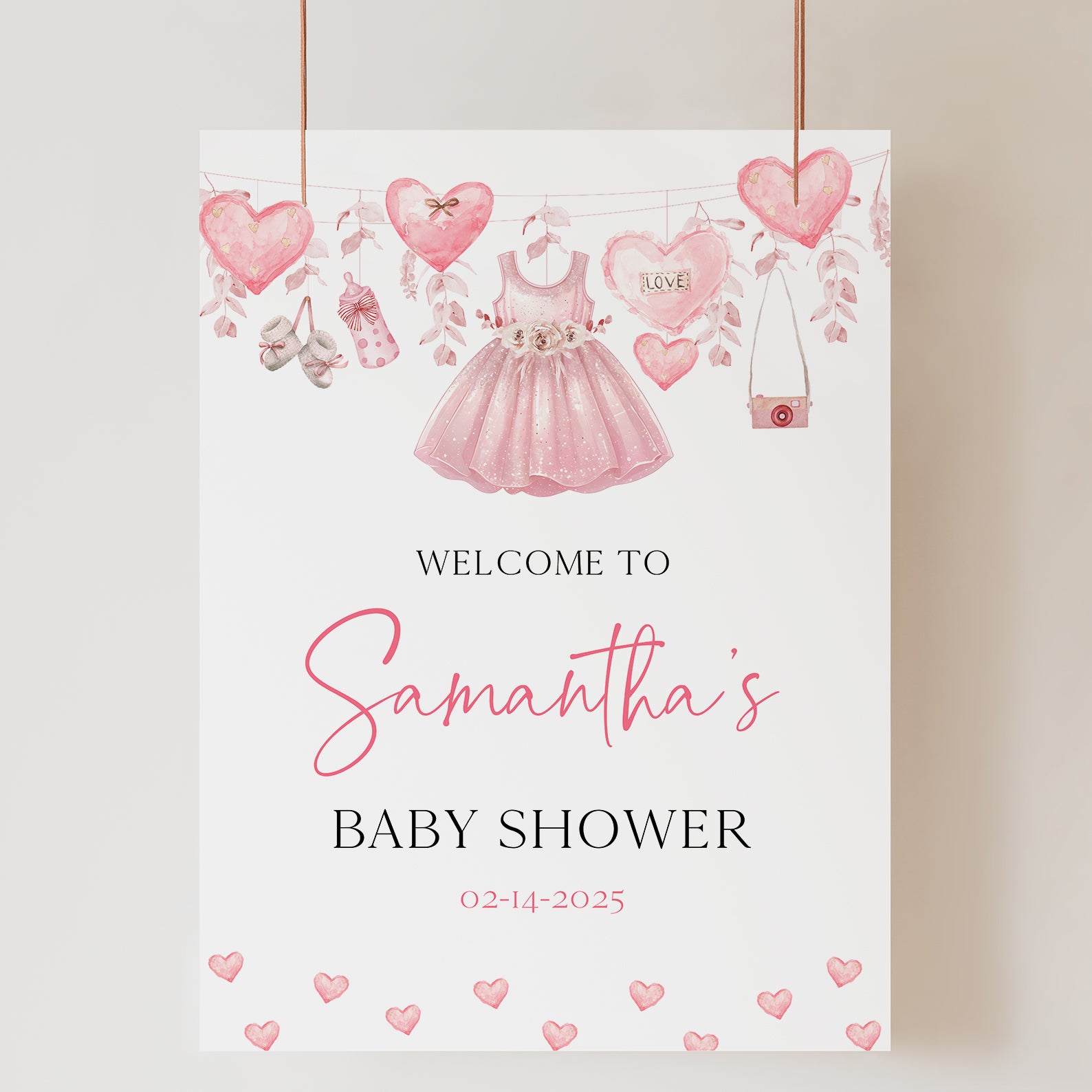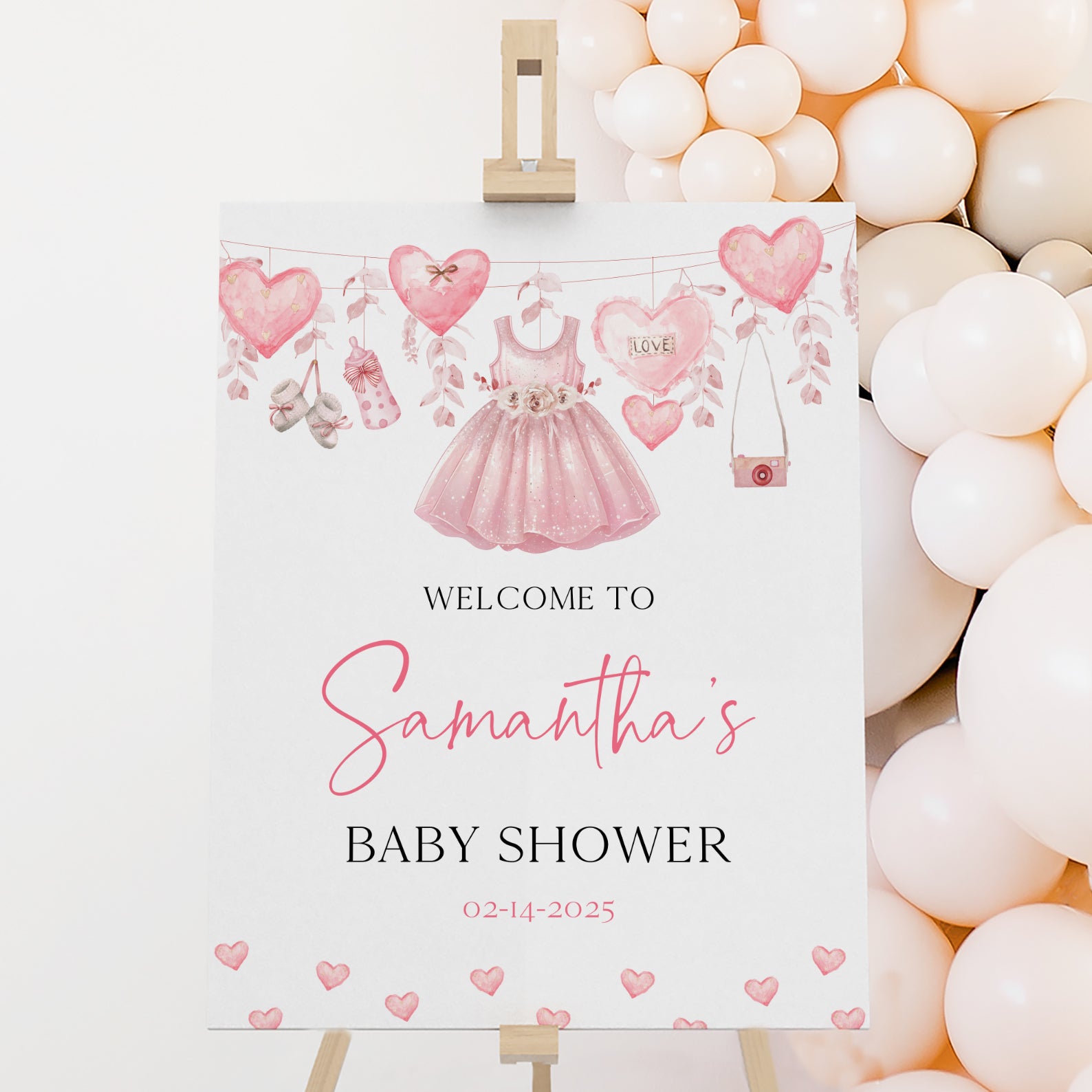 Welcome your little sweetheart with this charming baby shower welcome sign! Adorned with hearts, baby shoes, a pink baby dress, and delicate accents, it sets the perfect tone for a love-filled celebration.