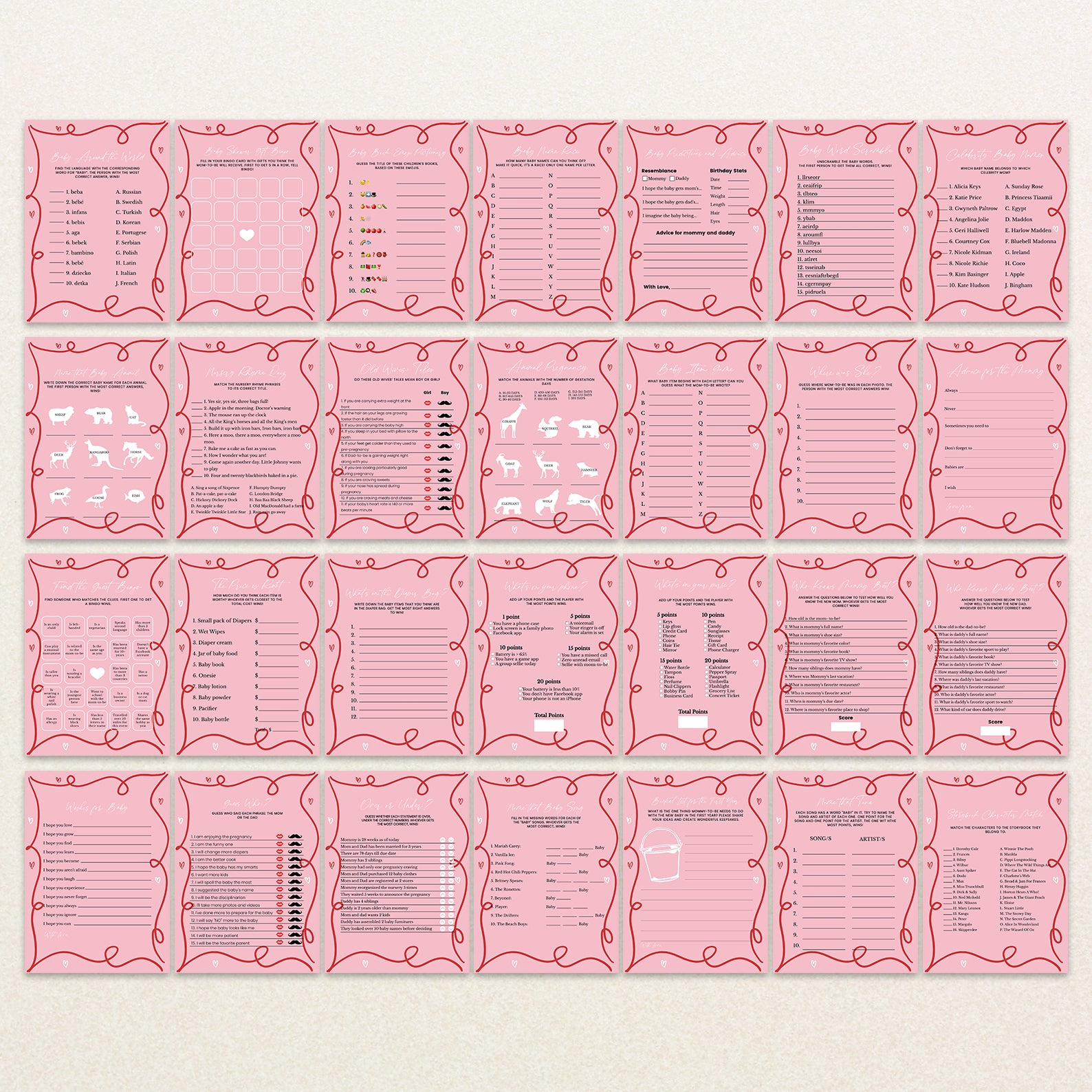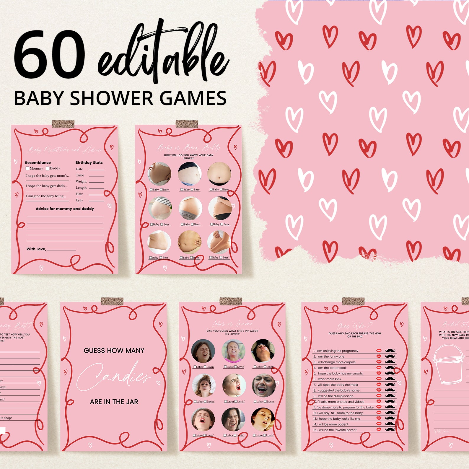 Add a touch of charm and excitement to your baby shower with this delightful bundle of 60 editable baby shower games, designed to perfectly complement your joyful heart-themed celebration. Featuring a playful mix of red and white hearts, along with a soft pink backdrop and red coquette ribbon accents, this collection brings a festive and loving vibe to your special day. Fully customizable, each game is easy to personalize to suit your event’s details. Whether you're hosting a fun-filled gathering or a sweet, intimate celebration, this bundle will fill your shower with laughter and unforgettable memories.