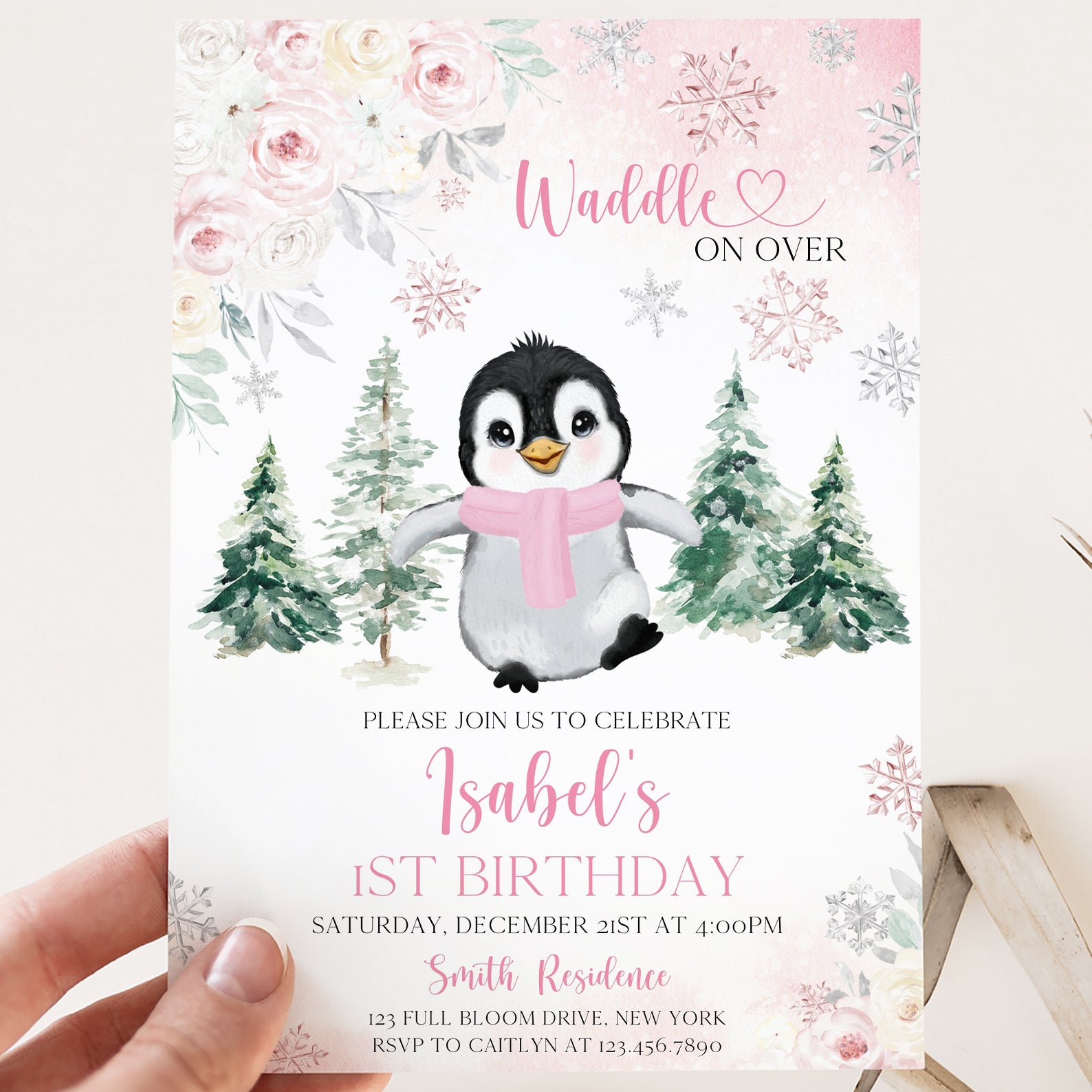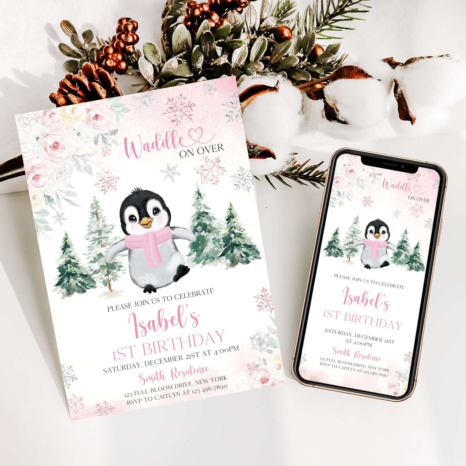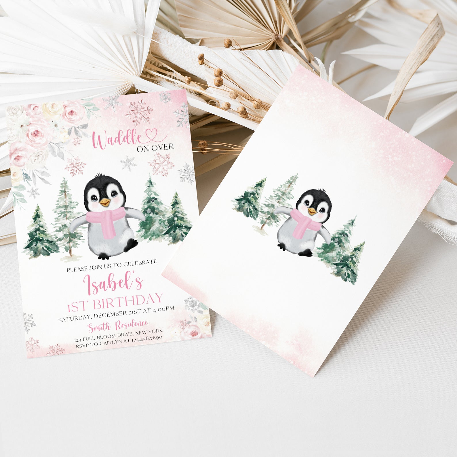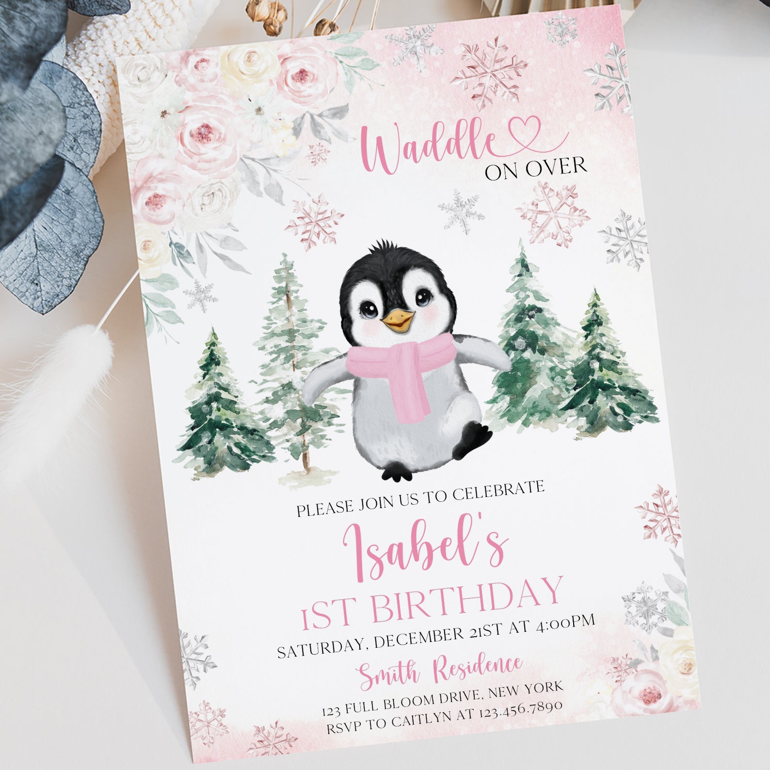 Celebrate your little one's first birthday with our charming Winter Birthday Digital Invitation! Featuring an adorable baby penguin bundled up in a cozy scarf, this invitation is designed with a delightful floral border and whimsical falling snowflakes. Choose between a lovely pink or serene blue color theme to perfectly match your party's vibe. The enchanting backdrop of snow-covered pine trees sets the scene for a magical winter celebration. Invite your friends and family to "waddle on over" for a day filled with joy and laughter!