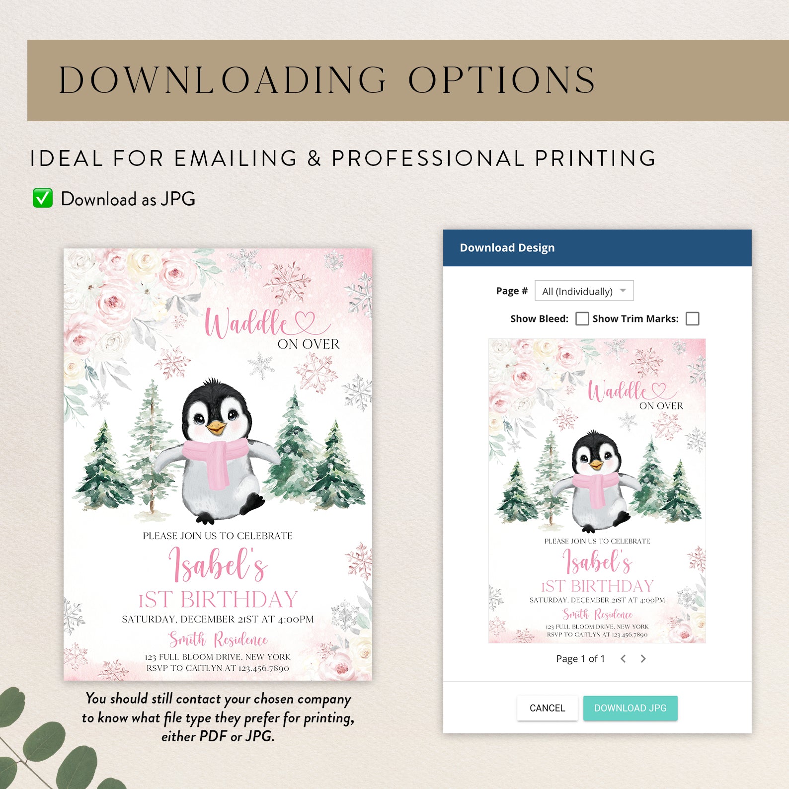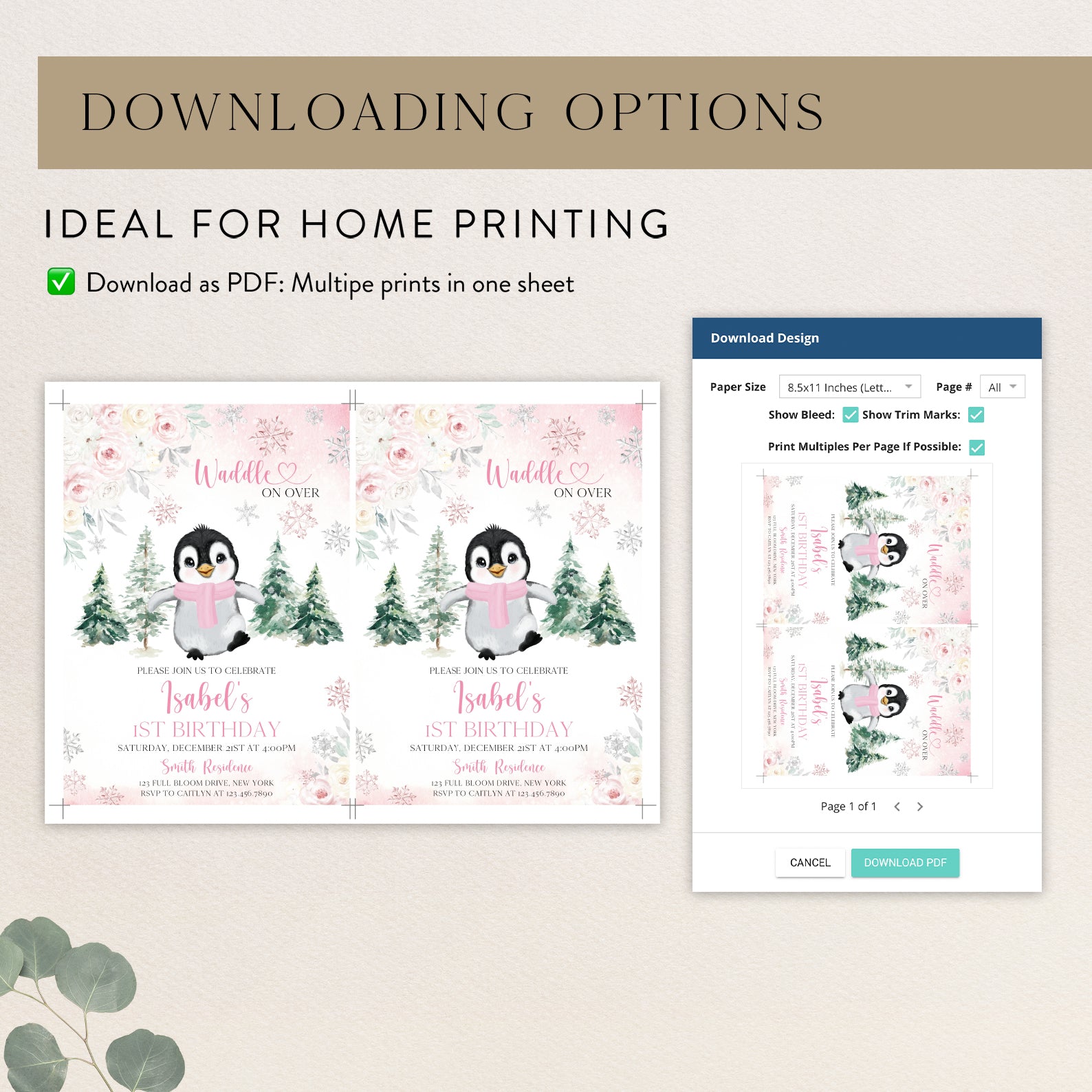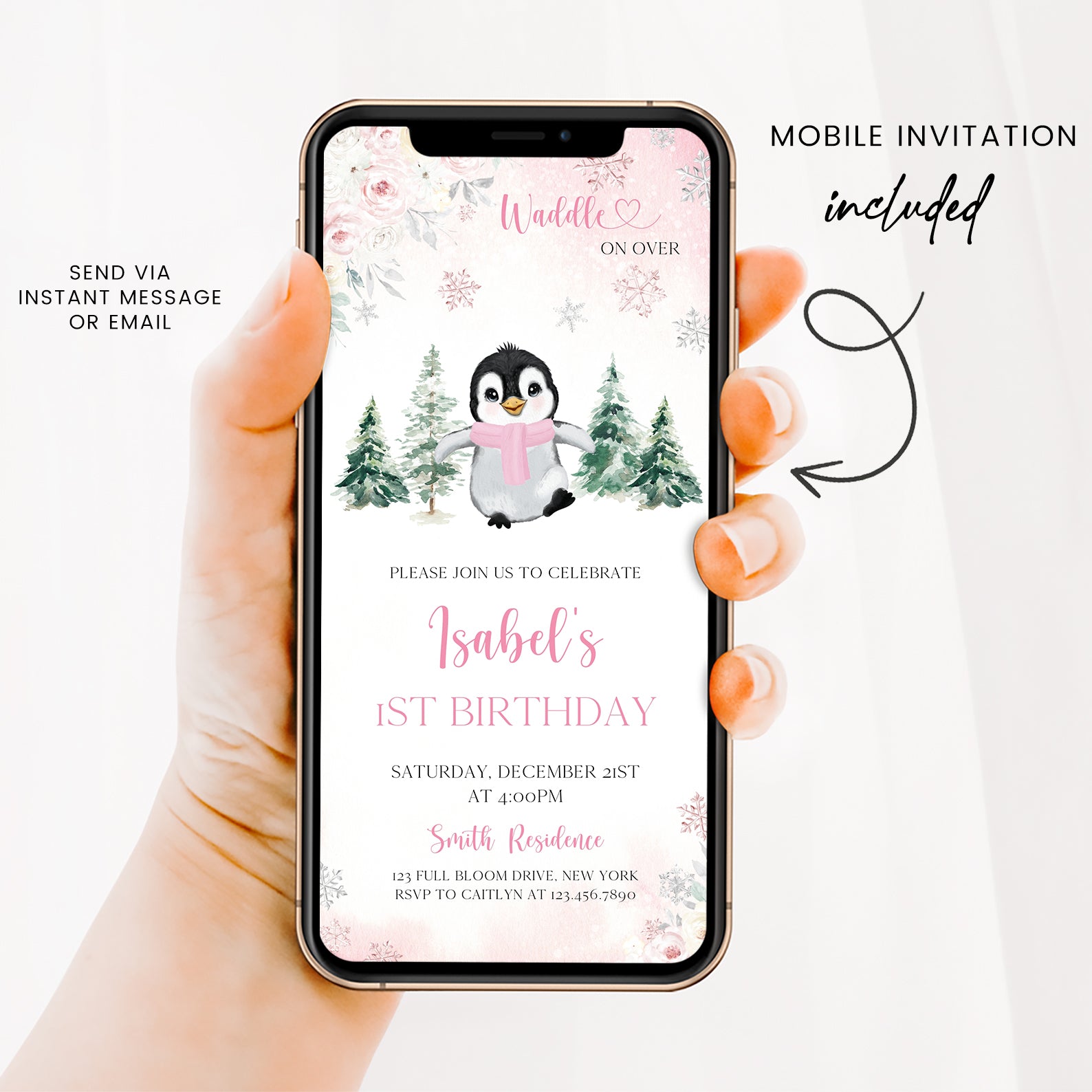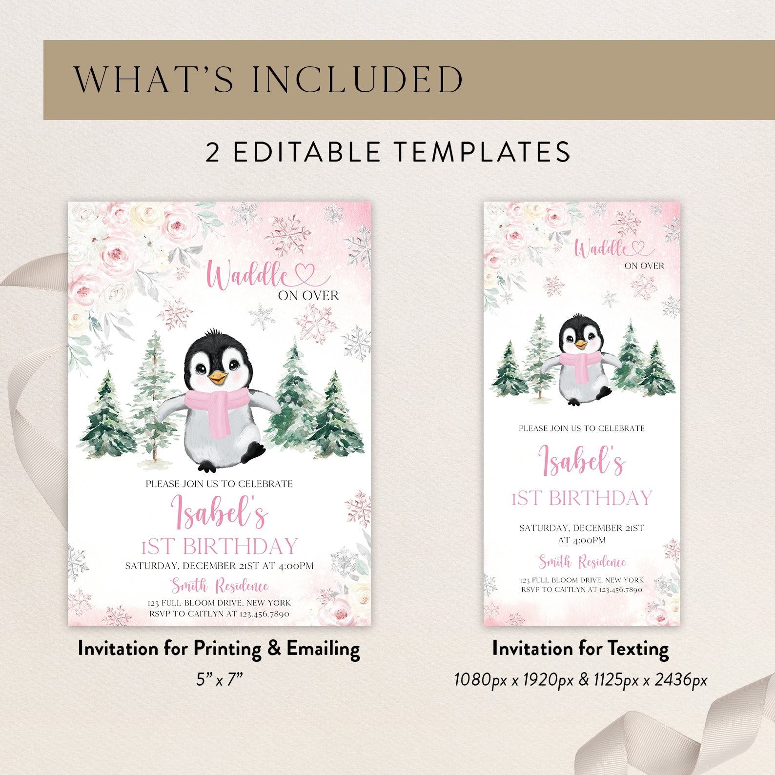 Celebrate your little one's first birthday with our charming Winter Birthday Digital Invitation! Featuring an adorable baby penguin bundled up in a cozy scarf, this invitation is designed with a delightful floral border and whimsical falling snowflakes. Choose between a lovely pink or serene blue color theme to perfectly match your party's vibe. The enchanting backdrop of snow-covered pine trees sets the scene for a magical winter celebration. Invite your friends and family to "waddle on over" for a day filled with joy and laughter!